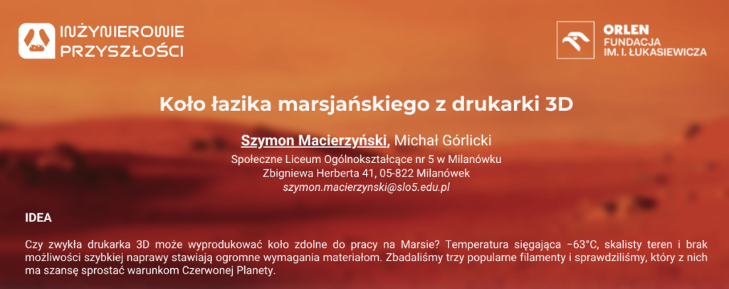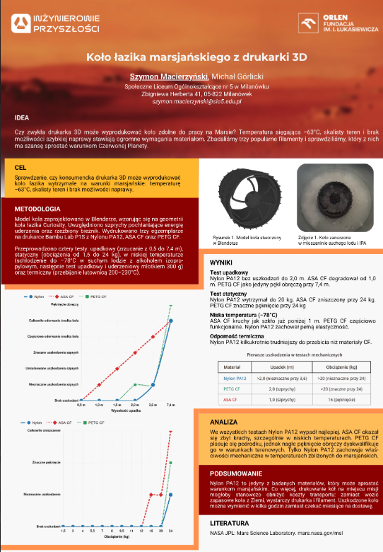 Szymon wraz z opiekunem, panem Michałem Górlickim, sprawdzał, czy zwykłą drukarką 3D można wydrukować koło łazika marsjańskiego, które wytrzymałoby warunki panujące na Marsie.